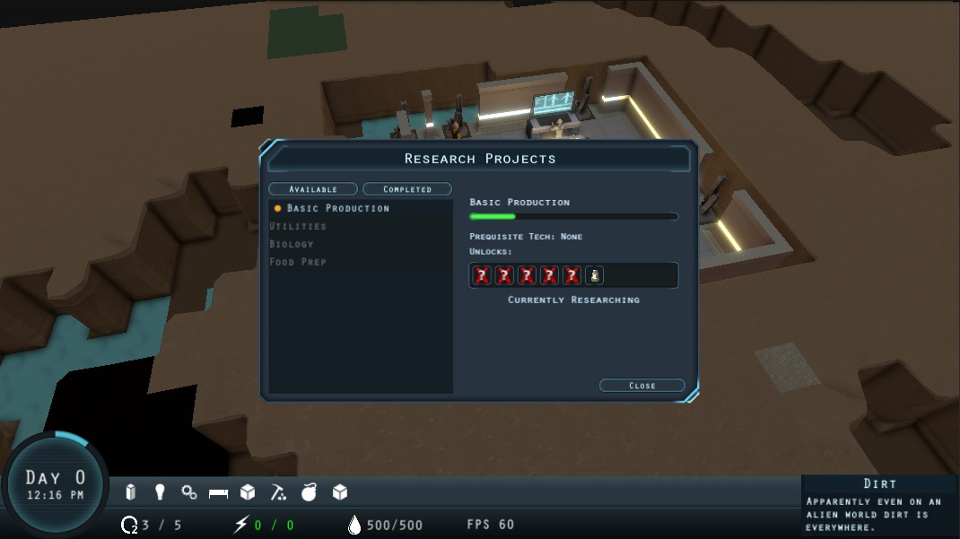 Research is handled by your colonists at the research station after choosing what research project to be worked on. I’m still working on ensuring a scientist doesn’t starve himself to death while researching forever. Research can be sped up by either having a higher level scientist or having more than one scientist/research station researching at the same time.